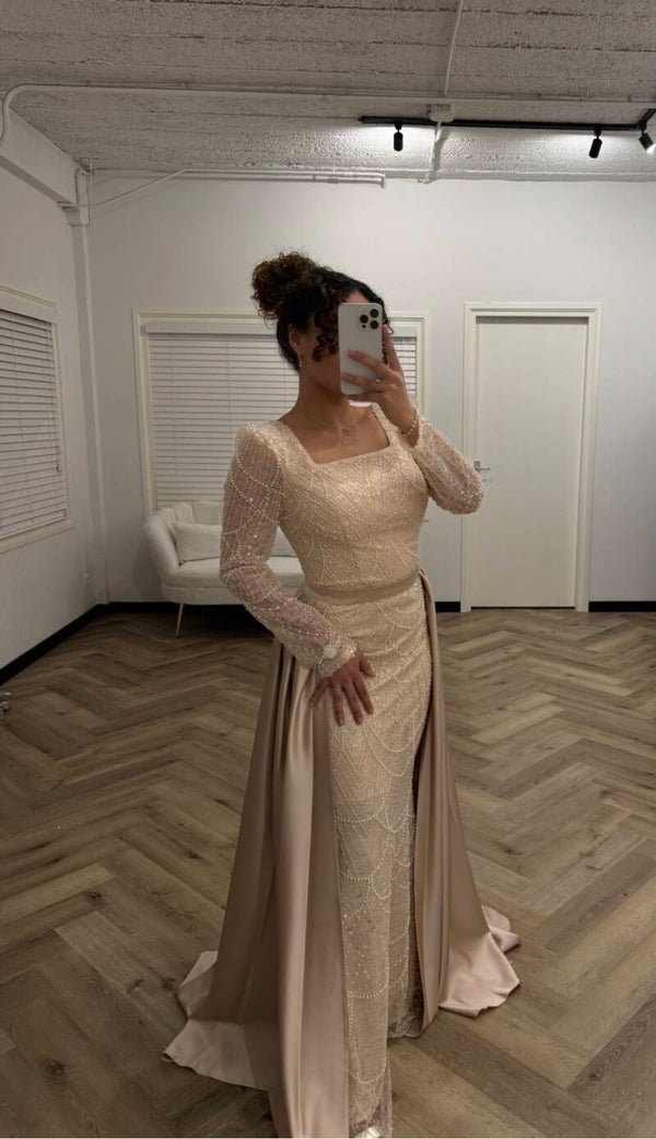 An elegant champagne beaded gown with sheer sleeves and flowing satin panels.